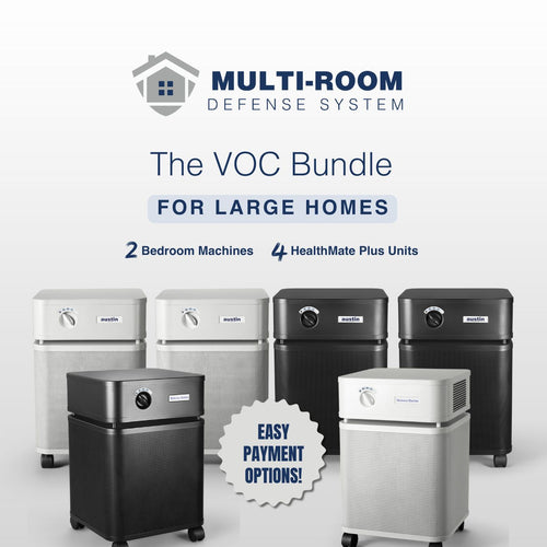 Formulated for those burdened by indoor VOCs from synthetic scents, cleaning products, new furniture, new flooring, paint, or new building materials. This bundle uses heavy-duty potassium iodide impregnated carbon filtration with zeolite for better adsorption of a wide range of VOCs, gases, and odors, especially formaldehyde.