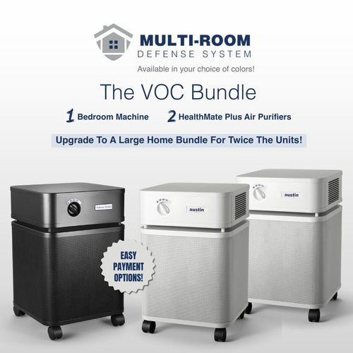 Formulated for those burdened by indoor VOCs from synthetic scents, cleaning products, new furniture, new flooring, paint, or new building materials. This bundle uses heavy-duty potassium iodide impregnated carbon filtration with zeolite for better adsorption of a wide range of VOCs, gases, and odors, especially formaldehyde.