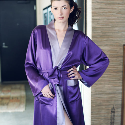 Slip into our exquisite reversible silk kumi robe. Classically styled with a contrasting collar and patch pockets, this gown is practical for everyday elegance. Its sumptuous comfort can be perfectly paired with any of our 100% pure silk gowns. Make this robe your ultimate indulgence.