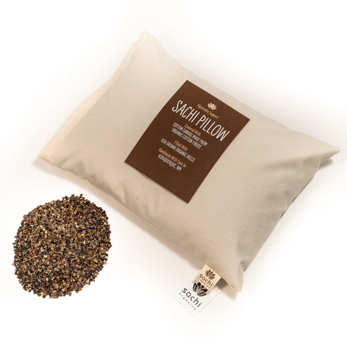 Help promote proper spinal alignment with Sachi Organics Buckwheat or Millet Support Hull Pillows! It conforms to your body, relieving pressure and muscle tension, reduces headaches, and is hypoallergenic. Also helps to circulate air and regulate the temperature around your head. Organic buckwheat hulls or millet hulls, covered in a canvas fabric of organic cotton fibers. Professionally made in America. This pillow contains no flame retardants and is chemical free. Washing is not recommended.